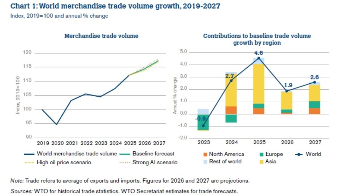 According to the latest Global Trade Outlook and Statistics report released by the World Trade Organization (WTO), world trade is projected to slow in 2026 following a 2025 performance that defied many expert predictions. While 2025 saw a robust 4.6% expansion in merchandise trade volume, current baseline projections suggest this growth will dip to 1.9% in 2026 before seeing a modest recovery to 2.6% in 2027.